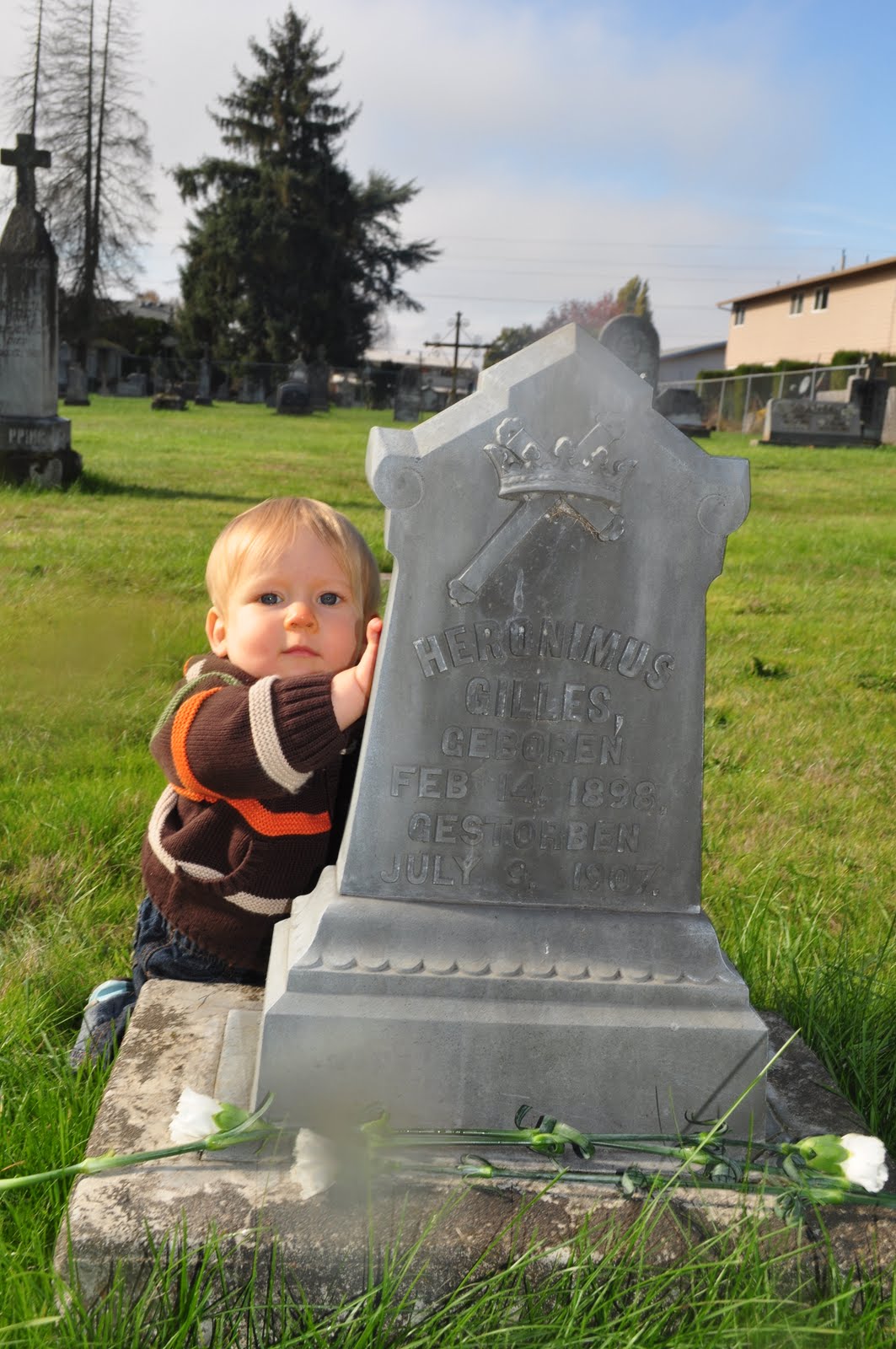 Then we headed back out 99E and stopped at the Calvary cemetery where my Gr. Great grandparents are buried as well as 3 of my gr grandma's brothers who lived well into adulthood. Somehow I couldn't find the uncles and their wives today; there is only so much tramping through wet grass with a squirmy baby and a preschooler prone to mischief I can handle. So I contented myself with offering flowers to the Gr. Gr. grandparents.